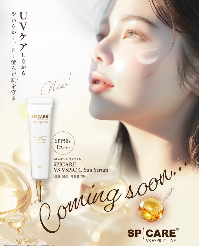 **守るだけじゃない、攻めのUVケア これからの季節にぴったりな SPICARE V3 VSPIC C Sun Serum が新登場 紫外線対策をしながら、 本格的な肌ケアまでできる進化系UVセラムです。 SPF50+ / PA+++ でしっかり守りながら、 なめらかでベタつきにくい使い心地◎ 天然シリカ由来のグロウスピキュール×ピュアビタミンCで、 “守りながら整える” 新しい日中ケアへ。 そして新発売を記念して… Cサンセラム+集中補給のCマスク付き特別セットもご用意 日中はCサンセラムで紫外線対策、 スペシャルケアにはCマスク。 透明感のある、なめらかな肌を目指したい方におすすめです